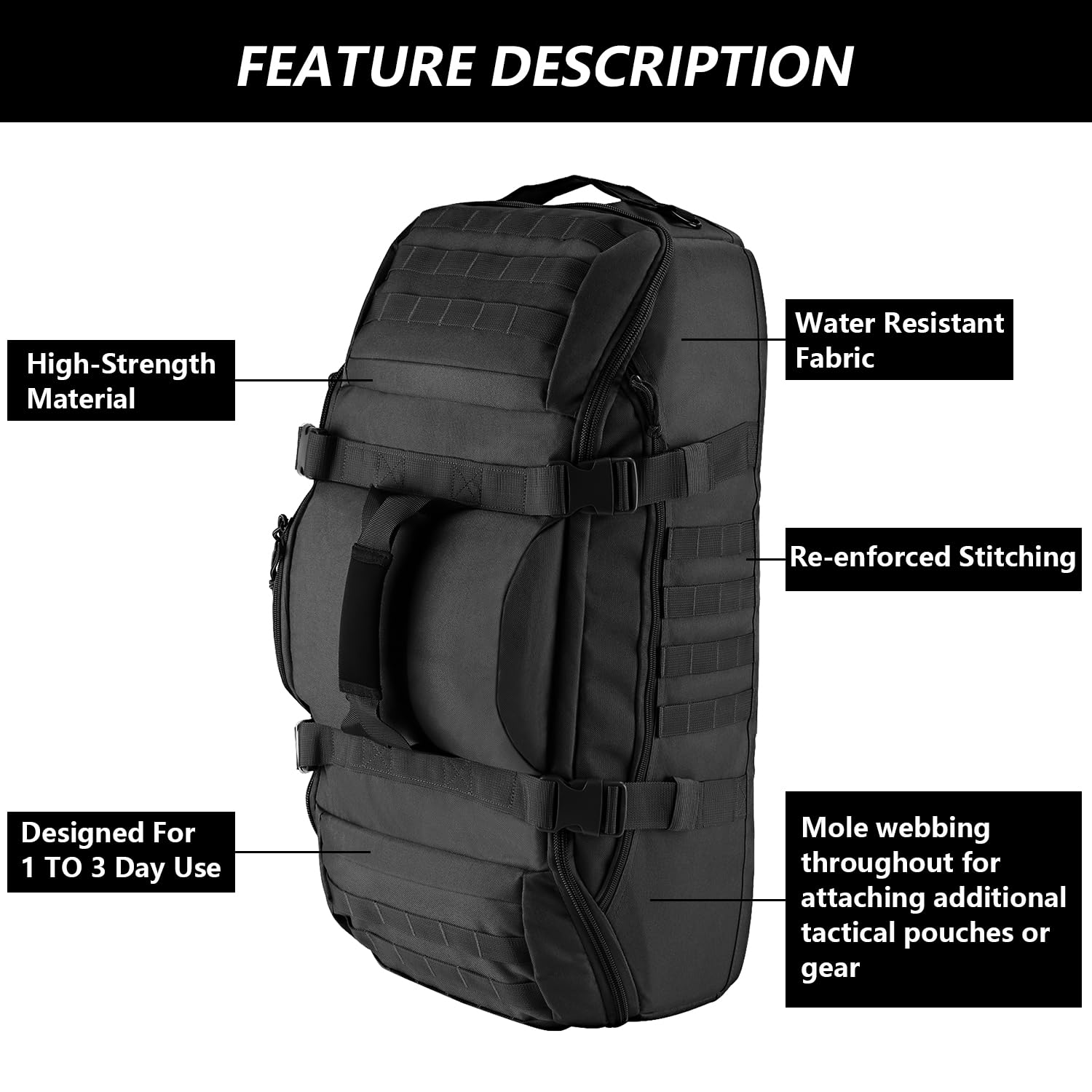 • Large Capacity: With dimensions of approximately 26.7" x 13" x 9.8" and a generous 65L capacity, this tactical backpack is perfect for carrying all your gear, whether for travel, gym, or utility use.